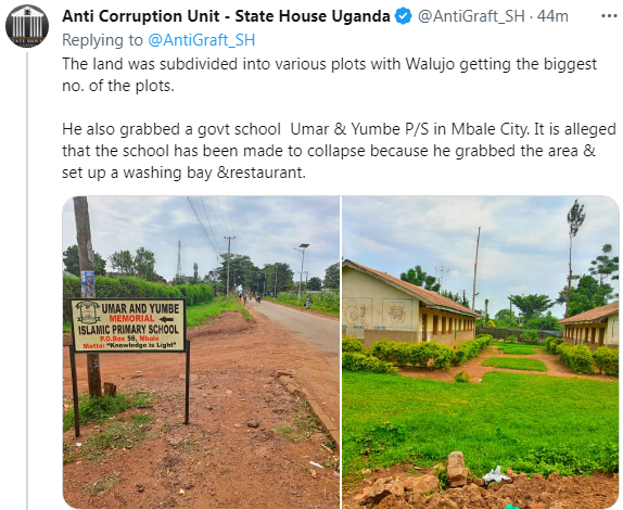 Walujo is accused of conniving with former officials of Nakaloke Town Council to illegally sell off 52 acres of government land in Nakaloke, keeping the largest share of plots for himself. He also allegedly grabbed Umar and Yumbe Primary Schools in Mbale City, causing the schools to collapse after erecting a car washing bay and restaurant on the school land.